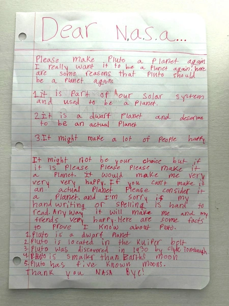 Школьница призналась, что понимает: решение зависит не от космического агентства. Однако это не остановило ее: «Но если это так, пожалуйста, пожалуйста, пожалуйста, сделайте его планетой», — написала она. Девочка также подчеркнула, что ее друзья полностью поддерживают эту идею, а в письме даже привела научные факты, чтобы доказать свою осведомленность.
