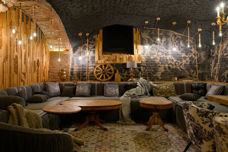 Стилистика «Дюжины» — это не историческая реконструкция, а авторское переосмысление. «Здесь нет современных решений. Элементы составлены из металла — это эклектика, стиль, который содержит в себе элементы русского, неоготического лофта», — объясняет архитектор. В интерьере смешаны викторианские мотивы, циркульные двери, фактура «ржавого» лофта и намеренно затемненная цветовая гамма с оттенком декаданса.