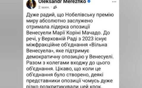 Глава комитета Верховной рады по международным делам депутат от партии «Слуга народа» Александр Мережко на фоне возмущения Белого дома в связи с тем, что президент США Дональд Трамп остался без Нобелевской премии мира, поделился радостью, что ее получила лидер оппозиции Венесуэлы Мария Корини Мачадо.